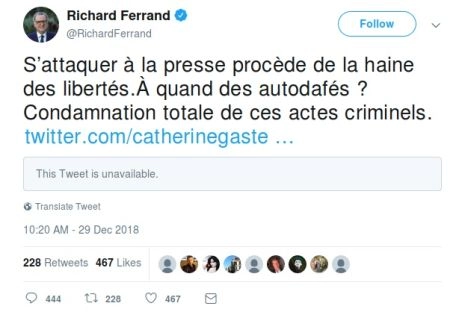 Les tweets fusent, particulièrement en provenance de la Macronie. Richard Ferrand, président de l’Assemblée nationale et twitto indigné : « S’attaquer à la presse procède de la haine des libertés. À quand des autodafés ? Condamnation totale de ces actes criminels. » Hugues Renson, vice-président du Palais-Bourbon : « Aujourd’hui, ce qui reste de radicalisés se sont mobilisés, non pas pour des convictions, mais pour s’en prendre à la presse de notre pays […] Pitoyable, médiocre et tellement significatif d’une dérive visant à saper notre démocratie ».