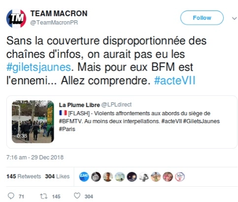 Le palmipède reproduit ensuite des appréciations similaires formulées par Richard Ferrand : « Lorsqu’il y a 50, 100 ou 200 types qui se regroupent à Montmartre avec un gilet jaune, vous avez l’impression que toute la France est en ébullition parce que cela passe en continu sur BFM ! » La Team Macron se met bien sûr au diapason dans un tweet (le 29 décembre) : « Sans la couverture disproportionnée des chaînes d’infos, on aurait pas eu les #giletsjaunes. Mais pour eux BFM est l’ennemi… Allez comprendre. »