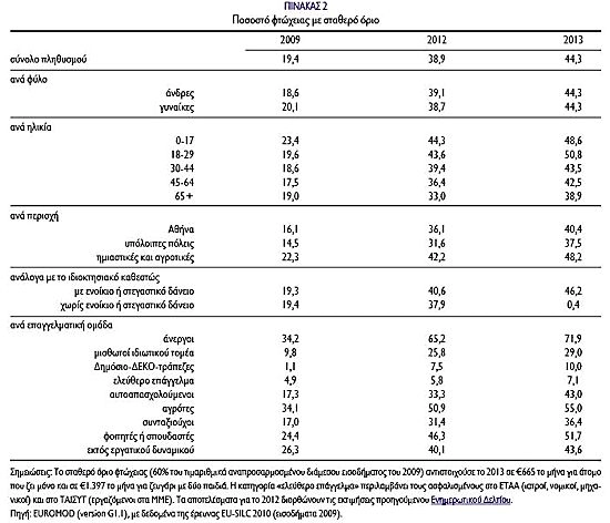 2° Le taux de pauvreté pour 2013 calculé à travers le nombre de personnes sous le seuil de 60% du revenu médian de 2009 (à prix constants) (revenu médian 1108 euros : seuil de pauvreté 665 euros pour une personne seule, 1397 euros pour un couple avec deux enfants) est de 44.3% ! (tableau page 5)