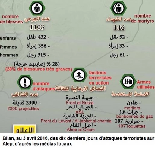 Il ne faut donc pas s’étonner de ce que racontent les médias officiels de France et de Navarre sur l’État syrien qui martyriserait son peuple. Pour tout commentaire, nous nous contenterons de traduire ce qu’a signifié, rien que pour la ville d’Alep, la mobilisation de ladite communauté internationale « afin d’exercer une pression sur le régime syrien pour que la trêve soit respectée… », en rappelant que le « gouvernorat » d’Alep comptait avant cette guerre sur la Syrie cinq millions d’âmes, dont trois millions à Alep.