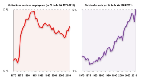 L’Observatoire français des conjonctures économiques (OFCE) a publié fin octobre une note de l’économiste Henri Sterdyniak, intitulée : "Compétitivité, le choc illusoire..." Sur la base de la comptabilité nationale accessible via l’Insee, on y trouve une comparaison entre les parts respectives dans la valeur ajoutée (VA) des CSE et des dividendes nets (dividendes versés moins dividendes reçus). Très parlante.