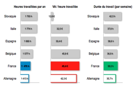 ï‚§ Malgré les 35 heures tant honnies par le patronat, les Français travaillent plus que les Allemands : en moyenne 1 476 heures par an, contre 1 413 en Allemagne. La durée de travail hebdomadaire effective, en moyenne pour les actifs, est de 38 heures (les 35 heures ont été effacées depuis longtemps) en France contre 35,7 heures pour les actifs allemands, en raison des nombreux emplois à temps partiel et petits boulots qui fleurissement outre-Rhin.