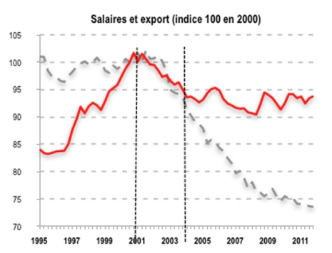 ï‚§ Entre 2001 et 2005, la perte de compétitivité-salaires entraîne une baisse de performance à l’exportation, partiellement en raison de la hausse du cours de l’euro durant cette période, qui renchérit les productions françaises hors de la zone euro.