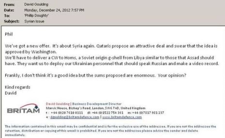 Voyons ce qu’il y avait dans les fichiers. L’élément clef est un e-mail daté du 24 décembre 2012 envoyé au directeur du Développement des affaires de défense de Britam, David Goulding, au directeur de Dynamic, Phillip Doughty qui est un ancien officier des SAS.