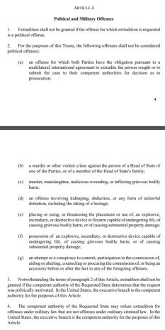 Baraitser rejeta la demande de la défense de tenir une audience préalable distincte pour déterminer si le traité d’extradition s’appliquait, sans se donner la peine de fournir la moindre raison (elle n’avait peut-être pas bien mémorisé ce que Lewis lui avait demandé d’approuver). Pourtant, il s’agit de l’article 4 du traité d’extradition 2007 entre le Royaume-Uni et les États-Unis, ci-dessous dans son intégralité :