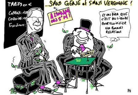 On a appris que pour poursuivre ses sinistres activités il touche personnellement 240 000 euros, presque plus que le président de la République, même après que celui-ci se soit augmenté de 140 %. Il se serait même fait à lui-même un « prêt » de 331 000 euro, à son nom, sur papier « libre », afin de payer un appartement de 190 m2 proche de l’Etoile, à un prix manifestement sous évalué, il a été indiqué qu’il rembourserait ces 331 000 euro en 2013, sans doute après que le prix de l’appartement ait été multiplié par 2, 3 ou 5. Cela a choqué des petites gens emprunteurs auxquels des prêts sont consentis à des taux usuraires. Mais le chef de bande est au-dessus de tout cela, lui, il est pour la suppression du Smic, parce qu’il trouve que ces gens-là gagnent trop. C’est même pour atteindre ses fins et supprimer le Smic, le droit du travail, etc. qu’il est payé.