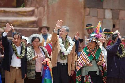 Une autre présence historique sera l’ombre de Simon Bolivar, le dirigeant indépendantiste du 19eme siècle qui lui aussi avait foi en la capacité des provinces des andes à changer la face de l’Amérique latine. Il chassa les espagnols des ces montagnes, et mena ses dernières batailles dans un pays qui prit son nom. Hugo Chavez, président du Venezuela, mentor de Morales et largement responsable de la canalisation de ce nouvel état d’esprit vers des chemins révolutionnaires, sera présent aussi ce fin de semaine. L’axe du Bien - comme l’appelle Morales- de Cuba, du Venezuela et de la Bolivie, est une énorme menace à l’hégémonie politique, économique et culturelle des Etats-Unis. Et c’est aussi un défi envers la gauche traditionnelle de l’Amérique latine, qui n’a jamais été très efficace dans la gestion des populations indigènes. A présent le représentant des fermiers, des mineurs, des producteurs de coca boliviens de souches ancestraux revêtira sera investi comme président et tentera de les intégrer dans la vie politique. Ils seront rejoints par des groupes plus ouvertement socialistes qui tirent leur légitimité d’un demi siècle de travail syndical - une alliance qui sera pour le moins aussi problématique pour le président que l’hostilité des Etats-Unis et des sociétés multinationales qui veulent exploiter le pétrole et le gaz bolivien. Ces dernières ne seront pas nationalisées mais devront certainement payer des royalties plus élevés.