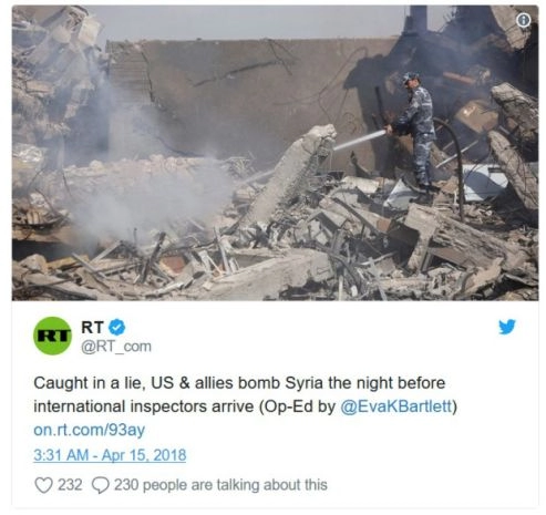 Enlisés dans leurs mensonges, les États-Unis et leurs alliés bombardent la Syrie la veille de l’arrivée des inspecteurs internationaux (Op-Ed par @EvaKBartlett) https://t.co/TB8POO8JXrpic.twitter.com/DTUZ4Dudly - RT (@RT_com) 15 avril 2018