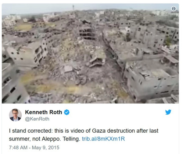 Je corrige : il s’agit d’une vidéo de la destruction de Gaza après l’été dernier, pas d’Alep. Kenneth Roth (@KenRoth) 9 mai 2015