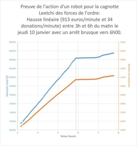 Dans la nuit du 9 au 10 janvier, un afflux considérable de donateurs, sans doute insomniaques, afflua sur le compte. Réveillé par un message privé Facebook (ding !), je notais en rafraîchissant périodiquement l’écran du site Leetchi :