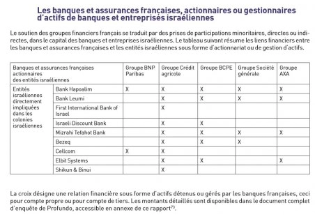 Une enquête menée par un collectif de syndicats et d’organisations de défense des droits humains françaises et palestiniennes, révèle comment les principales banques françaises soutiennent l’expansion coloniale israélienne aux dépens des territoires palestiniens, et de la construction de la paix. Pourtant, la France a officiellement condamné cette colonisation et soutenu les résolutions des Nations Unies en la matière. Les auteurs du rapport espèrent que ces banques hexagonales imiteront les grands fonds d’investissements européens et états-uniens qui excluent tout financement de la colonisation israélienne.