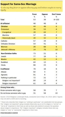 De même, les musulmans américains sont plus susceptibles de soutenir le mariage de même sexe (42% de soutien) que les évangélistes américains (28%), le protestants historiques noirs ( ? du traducteur) (40%), les Mormons (26%) et les Témoins de Jéhovah (14%). En effet, les musulmans américains sont à peu près aussi susceptibles de soutenir le mariage de même sexe que chrétiens en général (44%).