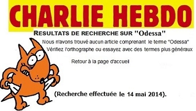 Le 14 mai, le mot « Odessa » et les noms des partis néo-nazis : Svoboda, Praviy Sektor, Trident, Patriotes d’Ukraine sont encore tabous dans Charlie-Hebdo.