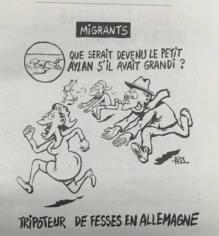 Le petit Ilyan dont la noyade n’en finit pas d’amuser Riss serait-il devenu tripoteur de fesses en Allemagne, hypothèse forte (unique) retenue par le dessinateur ? Pour le FN et Charlie Hebdo, l’évolution naturelle d’un étranger (surtout venant de… suivez mon regard) est