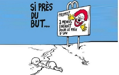 Le cadavre du petit immigré IIyan, échoué sur un plage, ne cesse d’amuser un Riss (deux dessins nullards sous sa plume) [ en vérité, quatre dessins. Note du GS, le 19/10/2024] qui pleura l’assassinat de ses collègues le 7 janvier 2015, qui nous apitoya sur ses propres blessures et qui ne bougea pas un cil quand la Justice poursuivit (jusqu’à 50 procédures mises en route, un enfant de 8 ans convoqué au commissariat, une grande gueule condamné à 6 mois de prison ferme, etc.) ceux qui clamaient un peu trop fort « Je ne suis pas Charlie » au lieu de défiler avec une brochette de chefs d’Etat, dont quelques dictateurs notoires, oppresseurs de la presse.