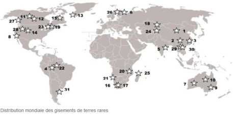 La Chine, bien que premier producteur mondial de terres rares ne détient pas la majorité des réserves : le 75% dénoncé par le documentaire dégringole à 36,2% selon le Département des recherches statistiques (voir tableau) 4. Le Brésil, avec des réserves estimées à 22 millions de tonnes (soit plus de la moitié de celles de la Chine), l’Inde, les États-Unis, le Canada, le Groenland, la Russie, l’Australie, l’Afrique du Sud, le Vietnam, la Thaïlande et plusieurs pays en Afrique de l’Est, notamment, disposent d’importants gisements.(voircarte)5
