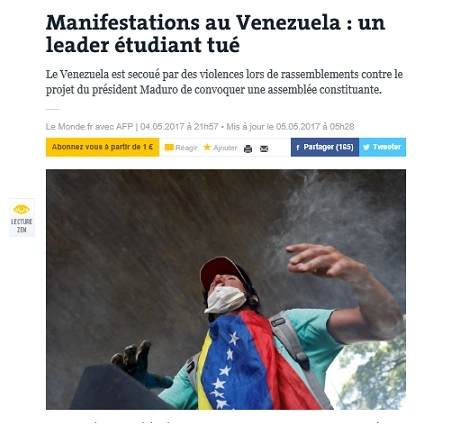 Exemple sordide de cette alliance : le 5 mai 2017, à l’aide d’une photo digne d’un ralenti hollywoodien (mais qui n’est pas celle de la victime) « Le Monde » dénonce « la mort d’un leader étudiant tué lors des protestations contre le projet du président Maduro de convoquer une assemblée constituante ». Or la victime, Juan (et non José comme l’écrit « le Monde ») Bautista Lopez Manjarres est un jeune dirigeant étudiant révolutionnaire assassiné par un commando de droite alors qu’il participait a une réunion de soutien au processus d’assemblée constituante.