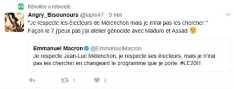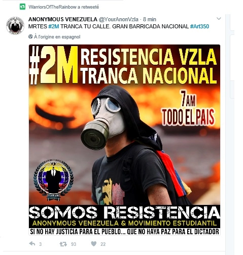 Et ci-dessous le retweeteur de cette belle affiche n’imagine sans doute pas la supercherie qui se cache derrière l’Anonymous vénézuélien. Cette capacité de l’extrême droite d’emprunter au mouvement alternatif mondial certains de ses symboles pour capitaliser un appui est décryptée ici : « Quand tombe le masque de Guy Fawkes de l’opposition vénézuélienne » (16)