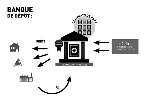 BANQUE DE DÉPÔT ou BANQUE COMMERCIALE : Établissement de crédit effectuant des opérations de banque avec les particuliers, les entreprises et les collectivités publiques consistant à collecter des fonds pour les redistribuer sous forme de crédit ou pour effectuer à titre accessoire des opérations de placements. Les dépôts du public bénéficient d’une garantie de l’État. Une banque de dépôt (ou banque commerciale) se distingue d’une banque d’affaires qui fait essentiellement des opérations de marché. Pendant plusieurs décennies, suite au Glass Steagall Act adopté pendant l’administration Roosevelt et aux mesures équivalentes prises en Europe, il était interdit aux banques commerciales d’émettre des titres, des actions et tout autre instrument financier.