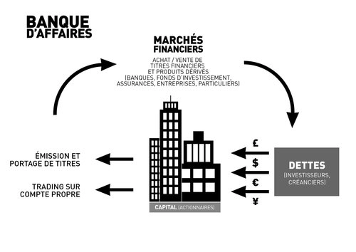 BANQUE D’AFFAIRES ou BANQUE D’INVESTISSEMENT : Société financière dont l’activité consiste à effectuer trois types d’opérations : du conseil (notamment en fusion-acquisition), de la gestion de haut de bilan pour le compte d’entreprises (augmentations de capital, introductions en bourse, émissions d’emprunts obligataires) et des placements sur les marchés avec des prises de risque souvent excessives et mal contrôlées. Une banque d’affaires ne collecte pas de fonds auprès du public, mais se finance en empruntant aux banques ou sur les marchés financiers.