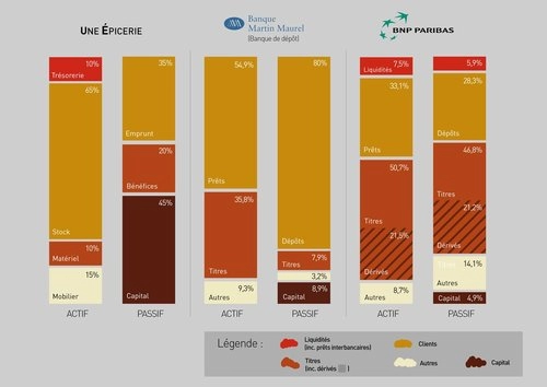 Dans le cas du bilan d’une banque, on retrouve au passif : le capital (les actions propres), les dépôts des clients, les réserves (bénéfices passés non dépensés) et la dette (notamment ce que la banque a emprunté auprès d’autres institutions). À l’actif, on retrouve les prêts (que la banques à octroyés aux particuliers, aux entreprises), les créances bancaires (prêts octroyés aux autres banques) et le portefeuille financier (actions, titres émis par d’autres sociétés et acheté par la banque).