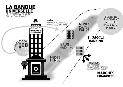 Les activités financières du shadow banking sont principalement réalisées pour le compte des grandes banques par des sociétés financières créées par elles. Ces sociétés financières (Special Purpose Vehicles – SPV*, money market funds*, hedge funds*…) ne reçoivent pas de dépôts, ce qui leur permet de ne pas être soumises à la réglementation et à la régulation bancaires. Elles sont donc utilisées par les grandes banques afin d’échapper aux réglementations nationales ou internationales. Des sociétés de gestions d’actifs comme BlackRock ou Pimco sont également actives dans le shadow banking et entretiennent des relations très étroites avec les grandes banques.