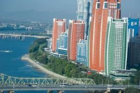 - A la rubrique loisir, Pyongyang c’est aussi, un delphinium, un cirque aux numéros les plus prisés au monde, un magnifique centre aquatique très fréquenté par des habitants aussi enjoués que mauvais nageurs. Plusieurs fois dans la semaine, des flots de jeunes femmes dans des tailleurs seyants (sans doute surannés pour nos modistes), instrument de musique à l’épaule se retrouvent avant le travail sur une place, à répéter le spectacle collectif vivant, qu’à l’occasion d’une fête, elles proposeront. Coincé entre plusieurs immeubles, il est loisible de pratiquer en toute tranquillité et sécurité, dans des parcs de toutes tailles, le volley-ball, les échecs, les cartes à jouer, le bavardage et de confier les enfants à des jeux d’explorations physiques.