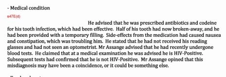 Quelle que soit la raison de l’inertie du gouvernement australien, un dossier consulaire daté du 8 août de la même année indique que Shipton a écrit pour informer que Julian avait été réadmis à l’infirmerie de Belmarsh et qu’un avocat rédigeait une lettre à Marise Payne, demandant au DFAT "d’utiliser ses sources diplomatiques pour obtenir une évaluation médicale indépendante (c’est-à-dire en dehors de la prison)".