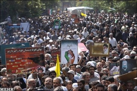 Quoi qu’il en soit, je me trouvais parmi plus d’un million de musulmans iraniens qui chantaient à l’unisson « Marg Bar Isre-hell ! » et « Marg Bar Am-ri-ca ! » Je suis sûre que tu sais ce que cela signifie, Tony : « A bas Israël, à bas l’Amérique ». Les hommes, femmes et enfants autour de moi ont passé la journée sans manger ni boire (Ca s’appelle le Ramadan, Tony, c’est un jeûne). Ils endurent la faim et la soif dans une chaleur étouffante, comme si de rien n’était. Dans le monde musulman, ils sont capables de supporter les privations, et ils sont fiers de souffrir pour exprimer leur colère contre le massacre des Palestiniens qui se poursuit. Pour protester contre le vol par les colons du peu qui reste des territoires palestiniens. Pour protester contre le blocus de Gaza qui provoque d’immenses souffrances pour des millions de gens.