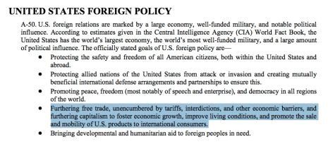 « Promouvoir le libre-échange, libre de droits de douane, d’interdictions et d’autres barrières économiques, et promouvoir le capitalisme pour favoriser la croissance économique, améliorer les conditions de vie et promouvoir la vente et la mobilité des produits américains aux consommateurs internationaux. »