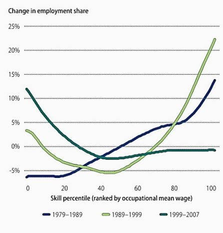 David Autor, l’un des spécialistes américains du sujet, a publié en 2010 une étude intitulée « The Polarization of Job Opportunities in the U.S. Labor Market ». Il y présente le très intéressant graphique 3.