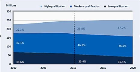 À première vue, le constat est sans appel : la part des travailleurs hautement qualifiés a augmenté, passant de 22,3% à 29,8% entre 2000 et 2010, et augmentera encore, jusqu’à 37% en 2020. Au contraire, le nombre de postes occupés par des travailleurs faiblement qualifiés est en baisse constante : 30,6% en 2000, 23,4% en 2010 et une prévision de 16,4% pour 2020. « Les jeunes n’ayant que peu ou pas de qualification trouveront de plus en plus difficilement un bon emploi » conclut logiquement le CEDEFOP (CEDEFOP, 2012b, p. 12).