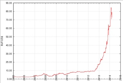 Valeur du dollar parallèle entre janvier 2005 et février 2014. Son augmentation exponentielle coïncide "bizarrement" avec le départ d’Hugo Chávez. Source : http://dolarparalelo.tk/