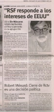 Dans mon livre, c’est mon héroïne qui rencontre Rangel/Randal (et qui le décrit fidèlement). Je parle donc à Eleazar Rangel de mon enquête, de RSF et de Ménard. Le lendemain, Ultimas Noticias publie un article avec un titre en gras et ma photo où RSF est dénoncée pour ses liens avec les USA. En dessous, espace réduit et sans photo, la conférence de presse de Robert Ménard.
