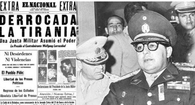 La police politique de Pérez Jiménez multiplie exactions et arrestations. Les diverses oppositions s’agrègent. Depuis le début de 1957 il existe, en exil, une Junte patriotique (JP) dirigée par le journaliste Fabricio Ojeda (Union républicaine démocratique ; URD). En font partie à haut niveau Silvestre Ortiz Bucarán (AD), Enrique Aristiguieta Gramko (Copei ; social-chrétien) et Guillermo García Ponce du PCV. Aucun des membres de cette junte n’a plus de trente-cinq ans. Grâce au parti communiste, la JP a des liens avec certains militaires. Le 1er janvier 1958, sous les ordres du colonel Hugo Trejo, une faction de l’armée se soulève. Partie de Maracay, une escadrille lâche quelques bombes sur Caracas. L’opération échoue. Du moins, en apparence. La colère populaire prend de l‘ampleur. Le 5 janvier, lors d’une manifestation à El Silencio (Caracas), les brigades de choc du PCV font pour la première fois usage de leurs armes. La Junte patriotique lance un appel à la grève générale. Les ouvriers du pétrole posent leurs outils. L’Eglise soutient officiellement la cause des conjurés. Caracas se hérisse de barricades. Le peuple laisse exploser sa colère. Jusque-là loyaux au dictateur, les chefs de la Force armée nationale sentent le vent tourner. Le 23 janvier, les armes à la main, les cellules du PC participent à l’apogée. Pour échapper à l’émeute, Pérez Jiménez saute dans un avion. Les valises bourrées de 300 millions de dollars, il s’enfuit à l’étranger.