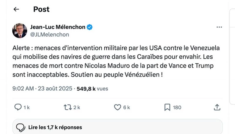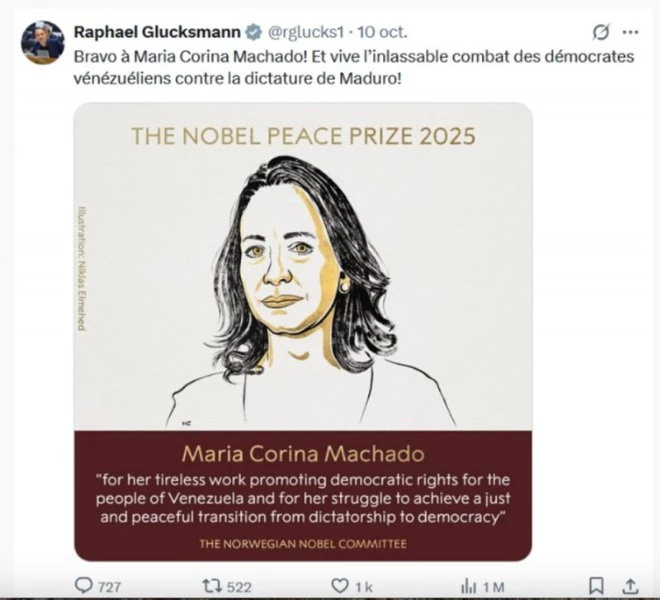Trump a estimé ne pas avoir besoin d’un accord du Congrès pour valider des opérations militaires ou menées clandestinement par la CIA contre le Venezuela ou d’autres pays (rajoutant dans son collimateur la Colombie et son président de gauche Gustavo Petro). En Amérique latine, les gouvernements inféodés au Bureau ovale – Argentine, Equateur, Paraguay, Pérou, Salvador, Trinidad et Tobago, etc. – applaudissent plus ou moins discrètement. En France, d’Emmanuel Macron à Raphaël Glucksmann, la droite a fait implicitement de même en félicitant l’extrémiste vénézuélienne María Corina Machado, partisane d’un bombardement de son propre pays, pour son récent « Prix Nobel de la Paix » [1].