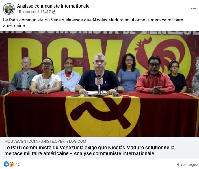 Reste la bataille de l’« international ». Pour l’heure, les « figueristes » ont le dessus. « Ils frayent avec l’extrême droite, mais on les croit communistes, lâche Griseldys Herrera. Ils tiennent parce qu’ils ont conservé les réseaux du parti. » Sans gravité exceptionnelle lorsque le sous-groupuscule PCRF (Parti communiste révolutionnaire de France) organise une collecte de fonds pour soutenir Tribuna Popular, organe du PCV « soumis à une persécution intolérable de la part de l’Etat vénézuélien et du gouvernement social-démocrate de Nicolas Maduro » [35]. Moins anecdotique lorsqu’une délégation « figueriste » figure à la Fête de l’Humanité (12 au 14 septembre 2025), invitée par un Parti communiste français (PCF) peu informé et divisé, ou pour le moins troublé par la situation (bien qu’à la base, du fait de sa proximité avec Cuba, la cause de la Révolution bolivarienne déclenche de la sympathie).
