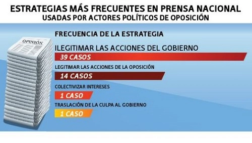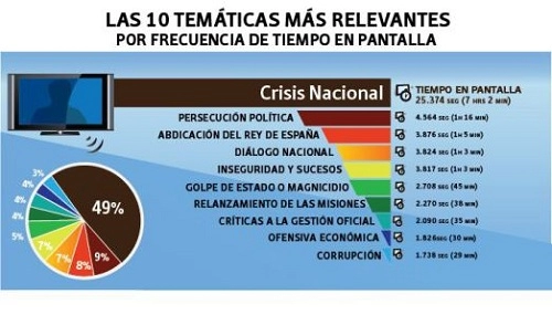 Les 49% des espaces télévisés ont été consacrés à parler d’une "crise nationale”. Pour la télévision privée il y a une "crise" qui n’est pas seulement économique mais politique, d’approvisionnement, de santé, de combustible, de construction, de services publics, de lignes aériennes, et même touristique. Dans différents articles certains leaders d’opinion se référaient à Nicolás Maduro comme "président” uniquement parce que le mandataire "aime qu’on l’appelle ainsi".
