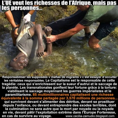 Responsabiliser les supposées « mafias de migrants » c’est essayer d’occulter les véritables responsables. Le Capitalisme est le responsable de cette tragédie : ceux qui s’enrichissent sur la sueur d’autrui et le saccage de la planète. Les transnationales gonflent leur fortune grâce à la torture des peuples : le saccage est viabilisé moyennant les guerres impérialistes, la répression et le paramilitarisme. 85 multimillionnaires capitalisent une richesse équivalente à la somme partagée par la moitié de la population de la planète (1) ; 3,570 millions de personnes qui survivent exploitées dans des fabriques tombeaux, devant s’alimenter des détritus, devant vendre leurs organes ou leur sang, devant se prostituer depuis l’enfance, ou devant entreprendre des exodes terribles, dont la culmination ne sera autre que la mort par noyade ou la noyade en vie, devant pâtir l’exploitation extrême dans l’Europe Forteresse, en cas de survivre au voyage.