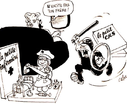 Personne ne leur balance quoi que ce soit ? Immense frustration ! L’ordre est alors donné de scinder le cortège, de le faire s’égailler dans plusieurs rue et quartiers pour de meilleurs images de foules clairsemées. Les grenades explosent, les vauriens en civil de la BAC cognent au petit bonheur la chance, jettent à terre, ligotent dans le dos avec des Serflex, un genou sur la tête de la victime. Ils l’embarquent en la traînant comme un sac de patates, accélérant le mouvement par des coups de pieds pour lesquels ils n’auront jamais des comptes à rendre (croient-ils. Attendez, mes bonhommes…) et ils déposent plainte au commissariat pour outrage parce que l’innocent a répondu « Ta gueule ! » à « Bougnoul, crouille, Kirikou, enculé de ta vieille pute de mère, je me fais sucer par ta salope de sœur ».
