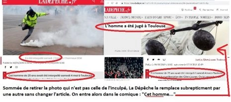 La Dépêche du Midi publie le 7 mai 2019 une photo d’un GJ cagoulé, entièrement masqué, shootant dans une grenade place du Capitole à Toulouse et légendée « Il a été interpellé samedi ». En dessous, l’article commence ainsi : « Cet homme de 25 ans avait été interpellé samedi... ». L’article, signé Claire LAGADIC, rend compte du procès de « Raphaël, un restaurateur de 25 ans. » Tout l’article est à charge et donne l’impression (chère à la faschosphère) que la justice est trop clémente. Les moments du procès qui ont été déterminants sont éludés (en particulier le témoignage). Du coup, pour le lecteur, Raphaël n’est pas forcément innocent. Pour la Justice, il l’est. Pas pour la Dépêche.