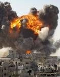 Explosion photographiée le matin du 14 janvier 2009 au centre de Gaza. Cette explosion atteste l’usage certain de GBU-39 en centre ville. Le panache de fumées et surtout la boule de feu indiquent des chaleurs "torrides" qu’aucune bombe ni au phosphore ni "classique" ne peut atteindre. La couleur blanche dans cette "boule de feu" semble indiquer une température supérieure à 1000°C, qui ne peut être obtenue que par l’apport de l’UA... Le panache de fumées noires est le résultat d’une "surcombustion" due à la carbonisation des éléments arrachés lors de l’explosion. Un panache qui monte à plusieurs dizaines de mètres d’altitudes au-dessus des maisons... Gare aux retombées.