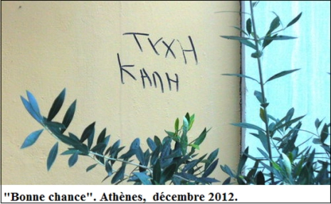 Quand on a un voeu à se dire, on se le dit alors entre nous, la bouche pleine de sens : liberté. C’est à peu de choses près ce que suggère une autre affiche récente sur certains murs d’Athènes nous souhaitant « Bonne année 1967 », 1967 étant l’année de la précédente dictature, celle des Colonels. Ce qui implique de notre part, un certain sens de l’histoire et de compréhension des enjeux en cours. Le stalag grec sera rejoint par les autres baraquements de l’U.E., elle-même, pièce (con)jointe à l’univers concentrationnaire de la planète des funds… saisissants. Déjà , les citoyens allemands ont été prévenus par la chancelière Merkel : « l’environnement économique sera plus difficile en 2013 qu’en 2012, [appelant] à la patience et au courage ». Nous comprenons que même les métropolitains de l’U.E. ne seront pas épargnés, quant à nous, sujets des colonies du… tiers-sud, n’en parlons pas.