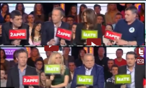 Ah, observez les pitres à qui le pitre en chef a fait distribuer de petites pancartes, comme naguère à « L’école des fans » de Jacques Martin (mais lui, c’était à des enfants de 6 ans), et qui dégoisent, leur petite pancarte en main (« zappe » ou « mate » l’émission de Taddéï), il ne faut pas la lâcher, le téléspectateur doit pouvoir suivre. Et ils ne la lâchent pas trop, pendant tout le débat. C’était entendu à la répèt. Vous donnez votre avis sur une émission culturelle, sur les qualités attendues d’un animateur, sur l’opportunité de laisser parler des sociologues sur une chaîne de service public, mais sans lâcher votre petite pancarte, c’est important ! Et alors, observez bien : certains ont conscience de leur infantilisation ; ils jouent avec leur pancarte, parfois la posent. D’autres, stoïques, toute honte bue, la tiennent bien droite. L’excité N° 2, un clone d’Hanouna, éructe ses débilités en la brandissant comme une pique sur laquelle il manque une tête, et on devine laquelle.