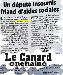 JLM hurle à la forfaiture, se montre violent, pas assez mais incompréhensible. Et le flot sorti des robinets à mensonges, ceux des médias qui se rêvent dominants, le noient, le moquent, le ridiculisent, l’invectivent. Jusqu’au Canard Enchainé qui, ceci étant dit en passant, détient 128 millions de provision sur ses comptes, crie « au voleur ». Dans le couloir de la mort sont placés les Insoumis. La cible de l’hebdomadaire du mercredi est le député de ce mouvement, Alexis Corbière. Cet incroyable bandit a bénéficié, complétement légalement d’une « aide au logement ». Pas du tout réservée « aux plus modestes », comme va le klaxonné BFM and co, mais distribuée en fonction des revenus déclarés. Comme, à l’heure de sa demande, Corbière est un modeste prof et sa femme une avocate sans assez de causes, qu’ils ont trois enfants, la feuille d’imposition n’est pas trop lourde. Les Corbière ont donc bénéficié d’une aide de 12 076 euros pour faire des travaux d’isolation et de lutte contre l’incendie. Tout cela n’est pas extravagant, et légal. Mais ça alerte les lanceurs d’alerte du Canard. En janvier 72, à une toute autre échelle mais en appliquant la même méthode, l’hebdomadaire a ainsi détruit la carrière politique de Chaban-Delmas par un dossier « d’avoir fiscal », tout aussi conforme à la loi que l’aide de Corbière. Ce sont ici les choix politiques du Canard, mais observons avec un sourire le synchronisme étrange entre un raid de justice et la publication d’une saloperie vraie dans l’hebdomadaire.