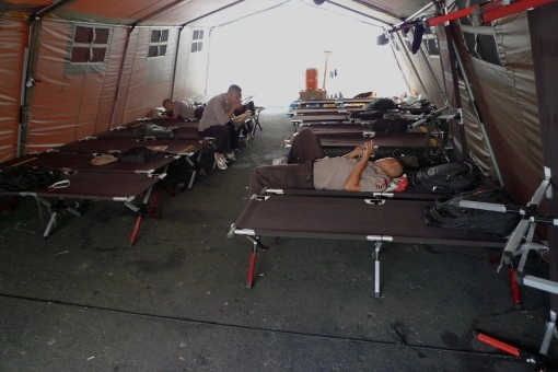 Cette année, ils ont installé beaucoup plus de Posko’s qu’en 2013. En principe, un posko est un poste de sauvetage, mis en place durant les désastres naturels, en théorie pour fournir de l’aide, distribuer de l’eau et de la nourriture ou offrir un abri. Tout autour de Kampung Melayu, il y a des douzaines de posko’s : même les forces spéciales Koppasus réputées pour leur brutalité s’y sont mis, de même que la police qui en gère un autre, juste à côté suivie d’une organisation islamique qui en fait de même. Chaque poste fait sa propre publicité. Mais à l’intérieur, c’est vide ; policiers et soldats se divertissent à des jeux, mangent ou dorment. Dans l’abri, il y a seulement une poignée de femmes et d’enfants. Les bateaux en caoutchouc sont au sec ; en train d’être gonflés et dégonflés tandis que d’autres bateaux de sauvetage sont adossés contre le mur. Grues, ambulances, bateaux ; beaucoup sont totalement à l’arrêt.