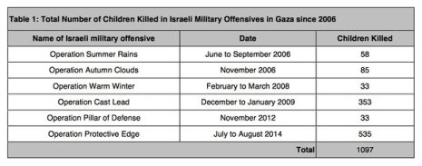Depuis l’an 2000, une génération d’enfants vivant dans la partie occupée « la Cisjordanie et Gaza », se sont fait tirés dessus, écrasés et bombardés » déclare le rapport. Il ajoute : « Pendant ce temps, les forces israéliennes et les colons ont tué plus de 1950 enfants palestiniens, dont la grande majorité vivaient dans la bande de Gaza. »