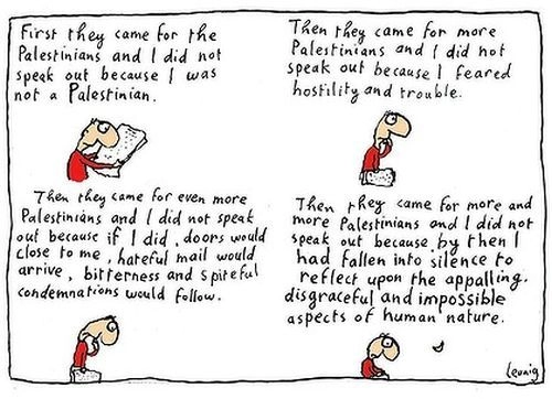 Mon récent dessin, ("Quand ils sont venus chercher les Palestiniens...") était une lamentation inspirée par les fameux vers attribués au Pasteur Martin Niemoller**, qui met en lumière le fait que l’apathie et le silence craintif face à l’injustice constituent un manquement à notre devoir moral. Il est intéressant de noter que Niemoller était un supporter nazi zélé mais que, dix ans après la guerre, il était devenu pacifiste.