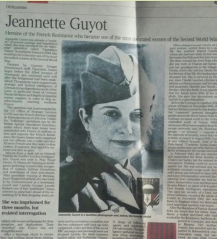Je suis tombé tout à fait par hasard sur la vie (et la mort) de Jeannette Guyot, décédée le 10 avril 2016 à l’âge de 97 ans : une grande dame, une authentique héroïne de la Résistance. Seule la presse britannique (le Times, le Telegraph qui lui a consacré une pleine page) a évoqué son décès en temps opportun. Quelques médias français (Le Monde, Le Point) ont repris l’information en provenance d’outre-Manche.