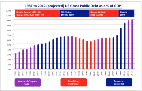 Le même constat s’impose en ce qui concerne les Etats-Unis. Là encore, il apparaît très clairement que les gouvernements républicains, volontiers présentés par eux-mêmes ou leurs adversaires comme libéraux (lorsque ce n’est pas « néo-libéraux » , voire « ultra-libéraux ») ne se sont guère signalés par l’efficacité de leur lutte contre l’endettement public. Les deux présidences de Reagan (1980-1988), souvent décrites comme l’archétype d’une politique économique orthodoxe (les reaganomics) vit s’accroître l’endettement à une cadence soutenue. Et plus près de nous, on doit également parler des mesures interventionnistes qui ont suivi la crise financière ; celle-ci ont aggravé l’endettement public en un laps de temps très court, et dans des proportions considérables (2008-2010). Or, si les effets de ces mesures apparaissent durant la présidence de B. Obama, il ne faut pas oublier que ces mesures ont été élaborées et votées par l’administration de G. W. Bush, qui est de surcroît intervenue directement pour sauver de la faillite plusieurs entreprises majeures du secteur financier.